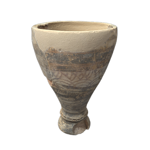 Fragment of painted Iberian pottery decorated with rectangular-shaped stamps from the archaeological site of Cerro de las Cabezas, Valdepeñas, Castilla-La Mancha, Spain. Iron Age (4th-3rd centuries BC). In the collection of the Valdepeñas Museum. Catalog number 545-CC12-Z1G-UE3. Model made in Reality Capture using 394 images. Additional processing completed in Geomagic Wrap, Zbrush, and Blender.