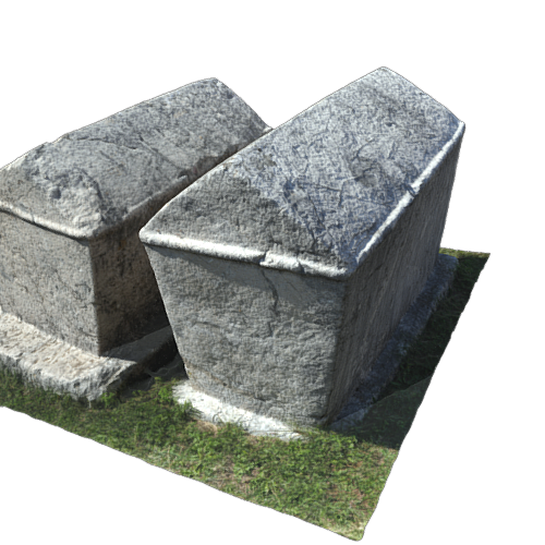 Stećak in the form of chest with a depiction of a court dance. Dimensions: height 81 cm, width 68 cm, length 156 cm.